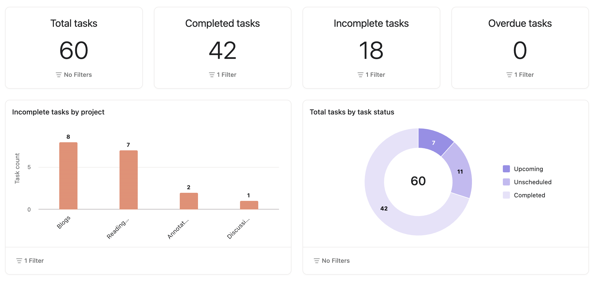 I mostly used the list view this week, but the dashboard, board (Kanban), timeline, and calendar views will be greatly helpful as I continue adding more tasks. The dashboard shows me an overview of my task progress, and the board view organizes my sections and tasks into vertical cards. In the timeline view, I can see when subtasks are due and what section they’re under. As for the calendar view, it shows me when the final task is due. Having a variety of view options makes listing and viewing work easier, for me and for teams. Each caters to a different need and is highly beneficial to the project’s success.