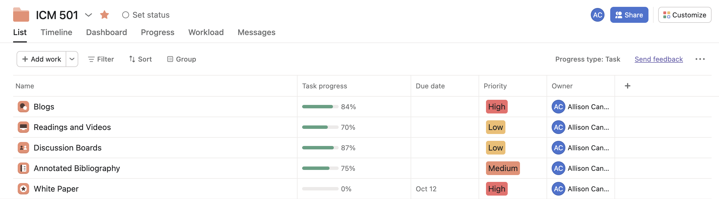 For my personal project management process , I decided to use the software application Asana. I tried out the applications Monday, ClickUp, and Trello and found their system set-ups confusing or not customizable enough for my liking. I used Asana to organize and document my tasks in my Master’s course.