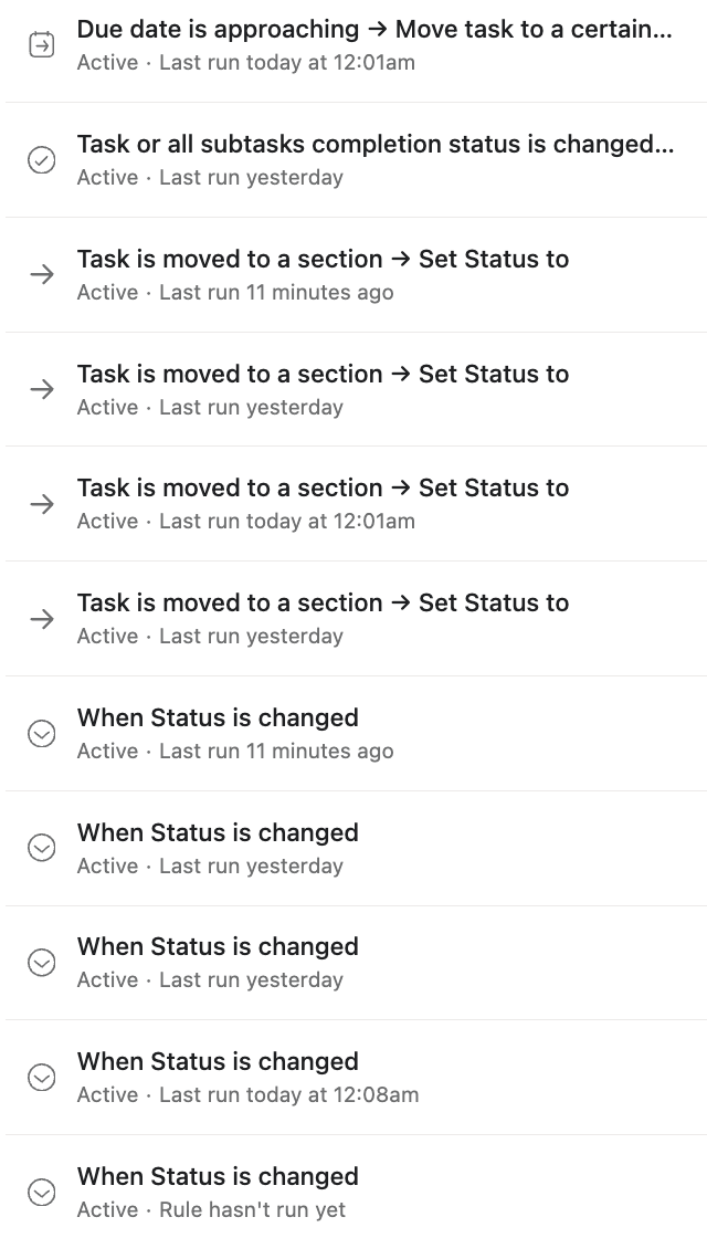 As mentioned by PMP Jennifer Bridges, I mobilized quickly by creating a project template and rules. Rules are what Asana describes as “a trigger that activates the rule and an action that is performed automatically.” These automatic functions allow for faster streamlining of tasks and make organizing my tasks much easier.